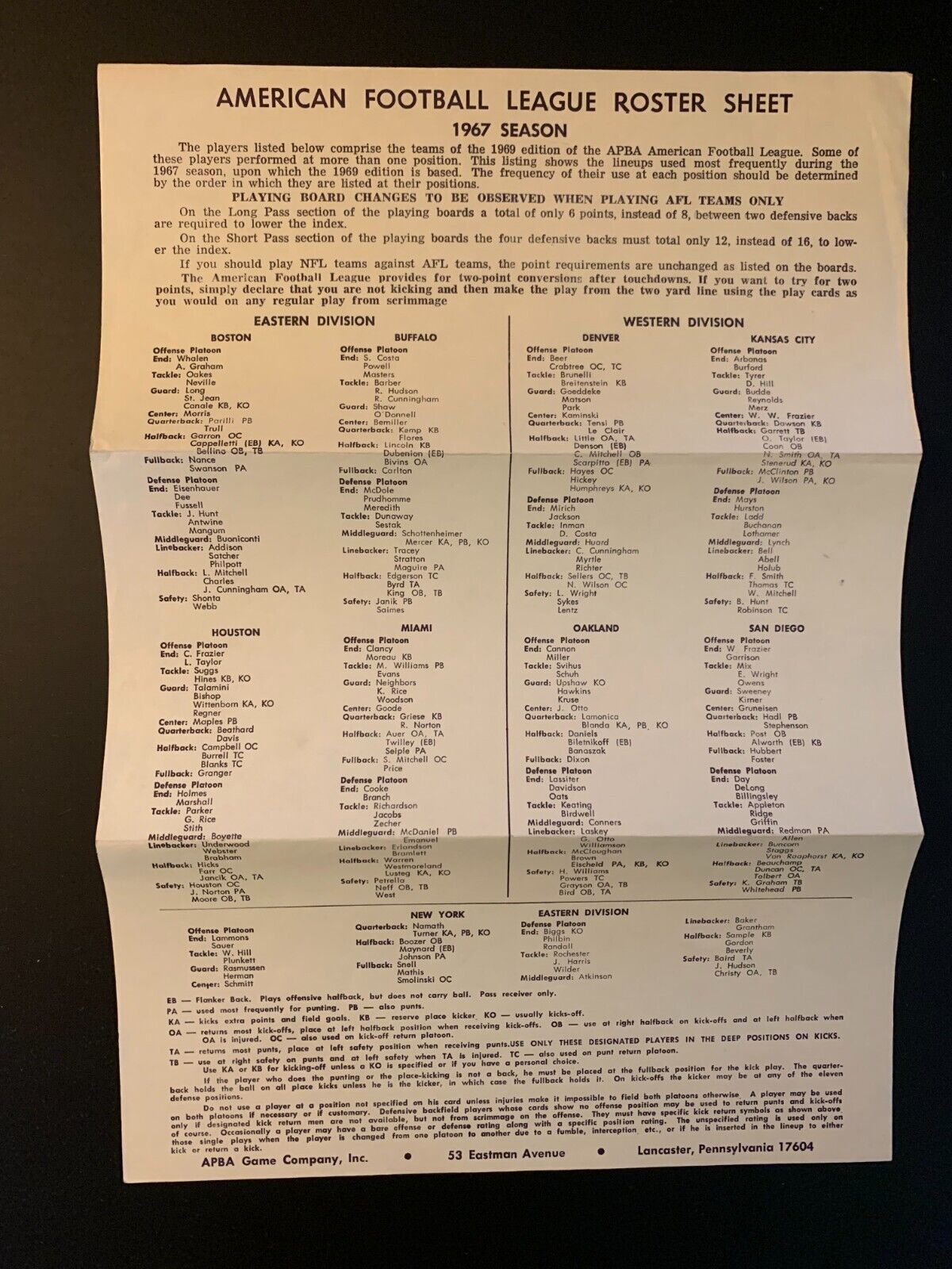 1967-APBA AFL roster